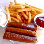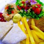 Pain pita*, falafels*, houmous*, tomates*, laitue*, concombre*, oignon, sauce maison*, frites*, ketchup*